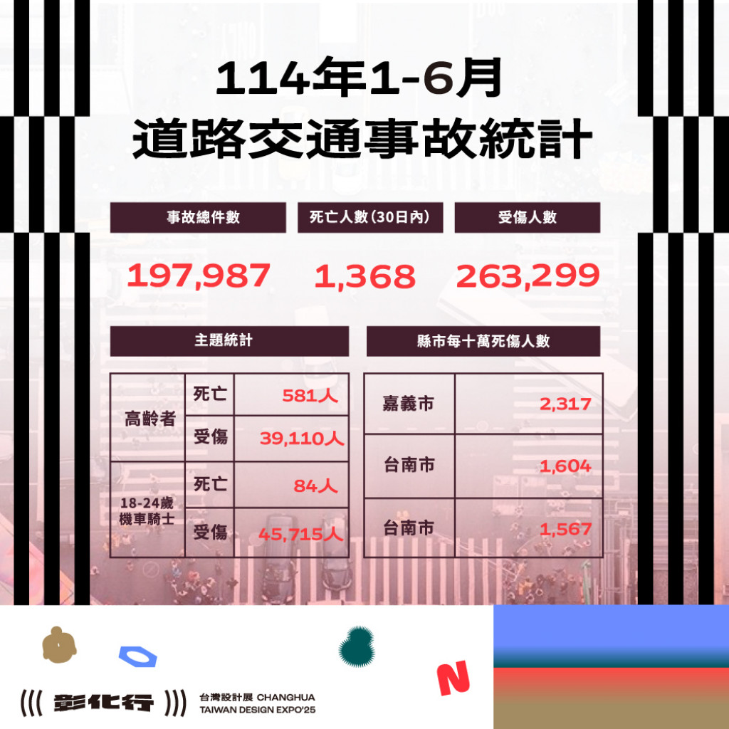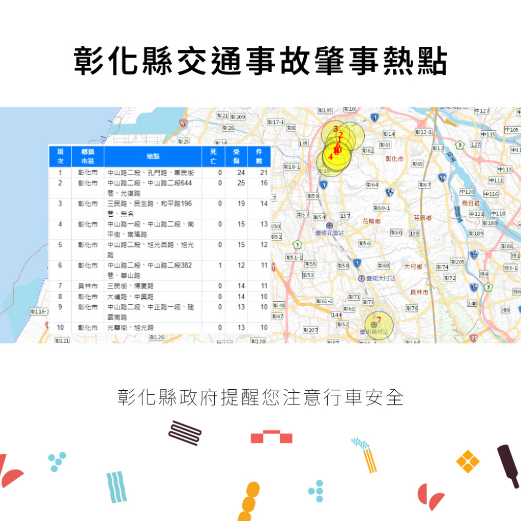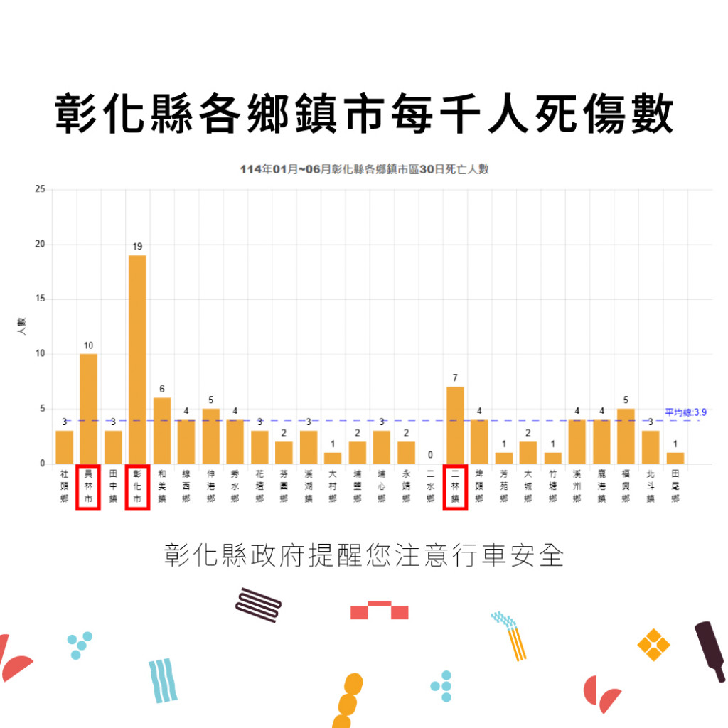 根據交通部道安資訊查詢網統計快覽數據跟112年同期比較分析,以少年自行車騎士(含電自、電輔) 事故增加47.7%最高,外籍人士事故增加38.6%次之,自小客車駕駛人增加25.4%再次之。1-6月份30日鄉鎮市每千人死傷人數於「彰化市、員林市、二林鎮」為多,肇事熱點以「彰化市」為多,合先敘明。